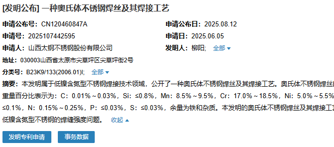 8月12日,山西太鋼不銹鋼股份有限公司成功申請一項名為“一種奧氏體不銹鋼焊絲及其焊接工藝”專利,申請公布號為CN120460847A,申請日期為2025年6月5日。