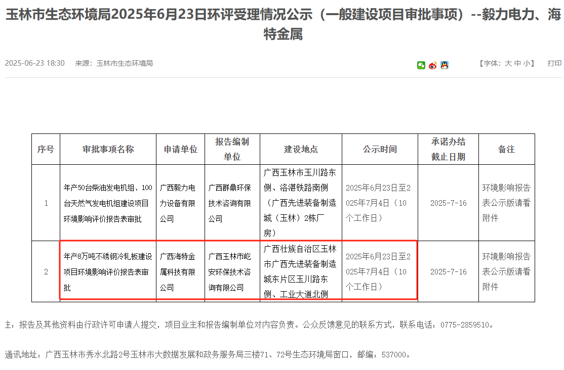 2025年6月23日,廣西玉林市生態環境局受理廣西海特金屬科技有限公司年產8萬噸不銹鋼冷軋板建設項目環境影響評價報告表并對外進行公示,公示時間:2025年6月23日至2025年7月4日(10個工作日)。