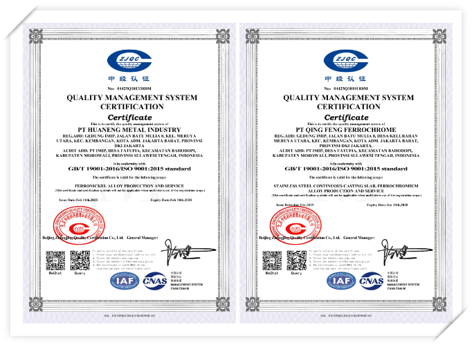 2月27日,印尼莫羅瓦利園區印尼青豐鉻鐵有限公司(QFF)、印尼昭輝鎳鐵有限公司(ZHN)、印尼萬嘉鎳業有限公司(ONI)等10家公司新獲ISO9001質量管理體系證書,此次為10家公司同步首次開展質量體系認證,涵蓋鎳鐵、鉻鐵、電解錳等全產業鏈業務板塊。