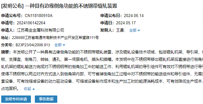 2024年6月14日,江蘇甬金金屬科技有限公司成功申請“一種具有邊緣倒角功能的不銹鋼帶輥軋裝置”專利,申請公布號CN118180910A,申請日期為2024年5月17日。